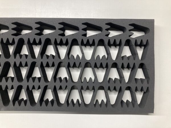 ウォータージェット加工は、水圧で加工するため、熱影響がなく、ゴムやスポンジのような柔らかい素材でも歪みなく加工できるのが特徴です。ウォータージェット加工であれば、今回の形状のような三角形とギザギザが組み合わさったような複雑な形状でも、CADデータを利用して対応可能です。また、製品の配置を画像のように90度曲げてネスティングすることもできるため、歩留まりの向上につながります。